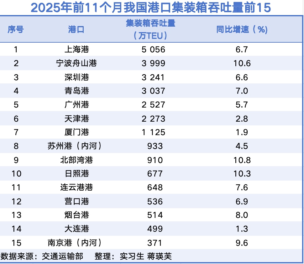 从中国北方港口看,山东港口2025年货物吞吐量超19亿吨、集装箱量超4700万标准箱。其中,青岛港、日照港、烟台港在2025年前11个月集装箱吞吐量同比增长7%、10.3%、8%。