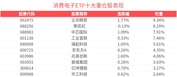数据显示,截至2025年10月31日,中证消费电子主题指数(931494)前十大权重股分别为立讯精密(002475)、寒武纪(688256)、工业富联(601138)、中芯国际(688981)、澜起科技(688008)、京东方A(000725)、兆易创新(603986)、豪威集团(603501)、亿纬锂能(300014)、东山精密(002384),前十大权重股合计占比56.3%。(以上所列股票仅为指数成份股,无特定推荐之意)