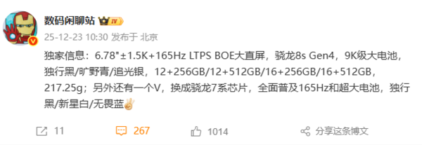 一加即将推出的全新Turbo系列机型配置信息曝光。据悉,该机将搭载一块约6.78英寸的1.5K分辨率、165Hz刷新率LTPS直屏,由京东方供应。核心配置方面将提供双平台版本:高配版搭载高通骁龙8s Gen4旗舰平台,标准版“一加Turbo V”则采用骁龙7系芯片,两款机型均将“全面普及”165Hz高刷与超大容量电池。